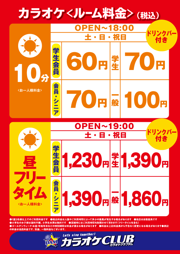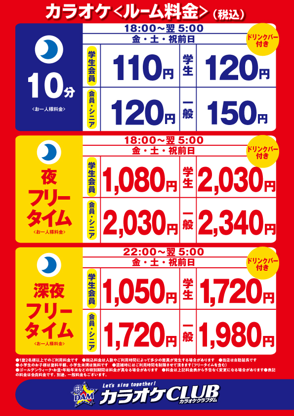 ※当店は会員・一般で料金体系が異なります。 会員カードは全国のカラオケCLUBでご利用いただけます。