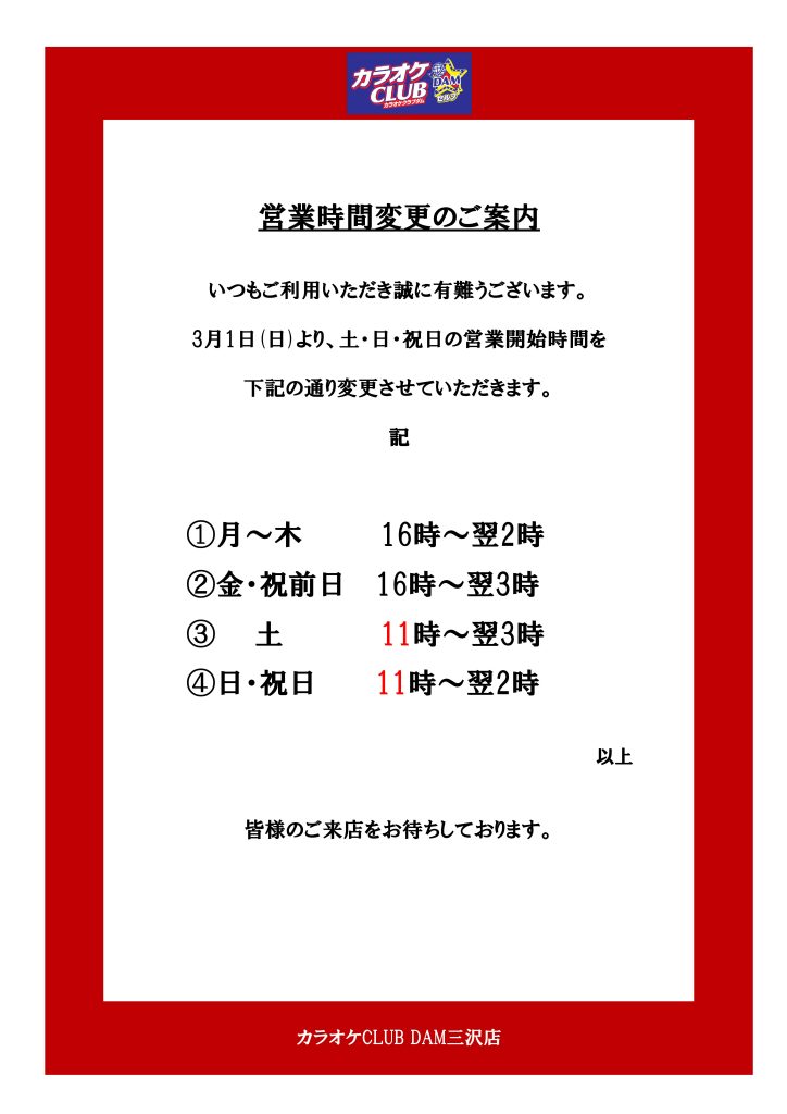 土曜日 16:00~翌3:00